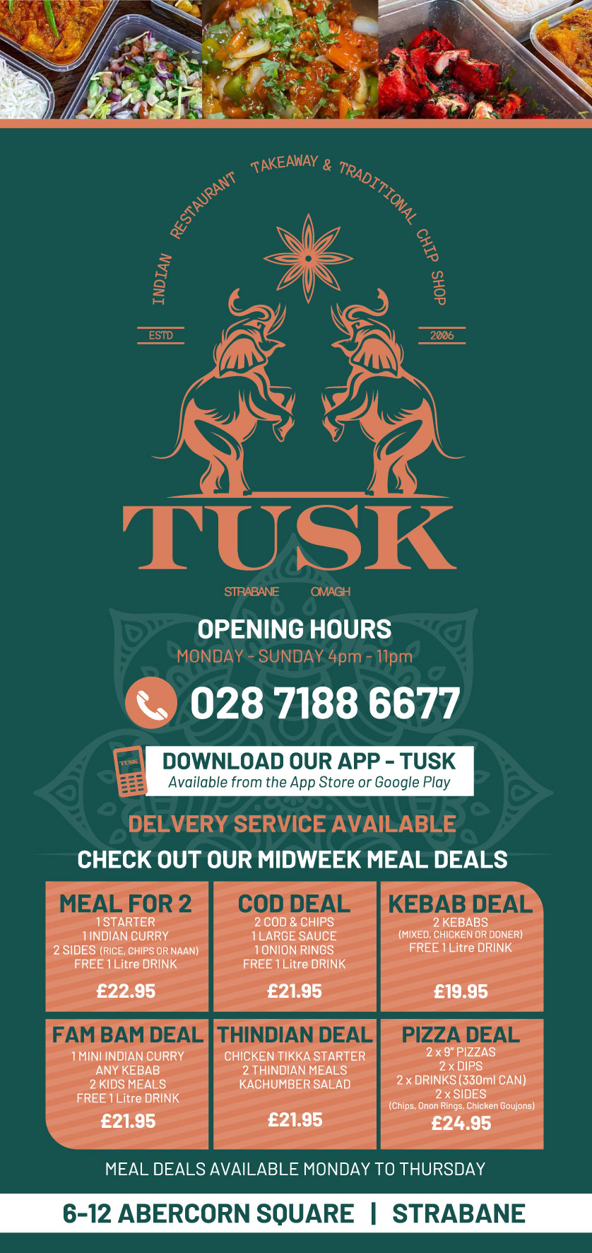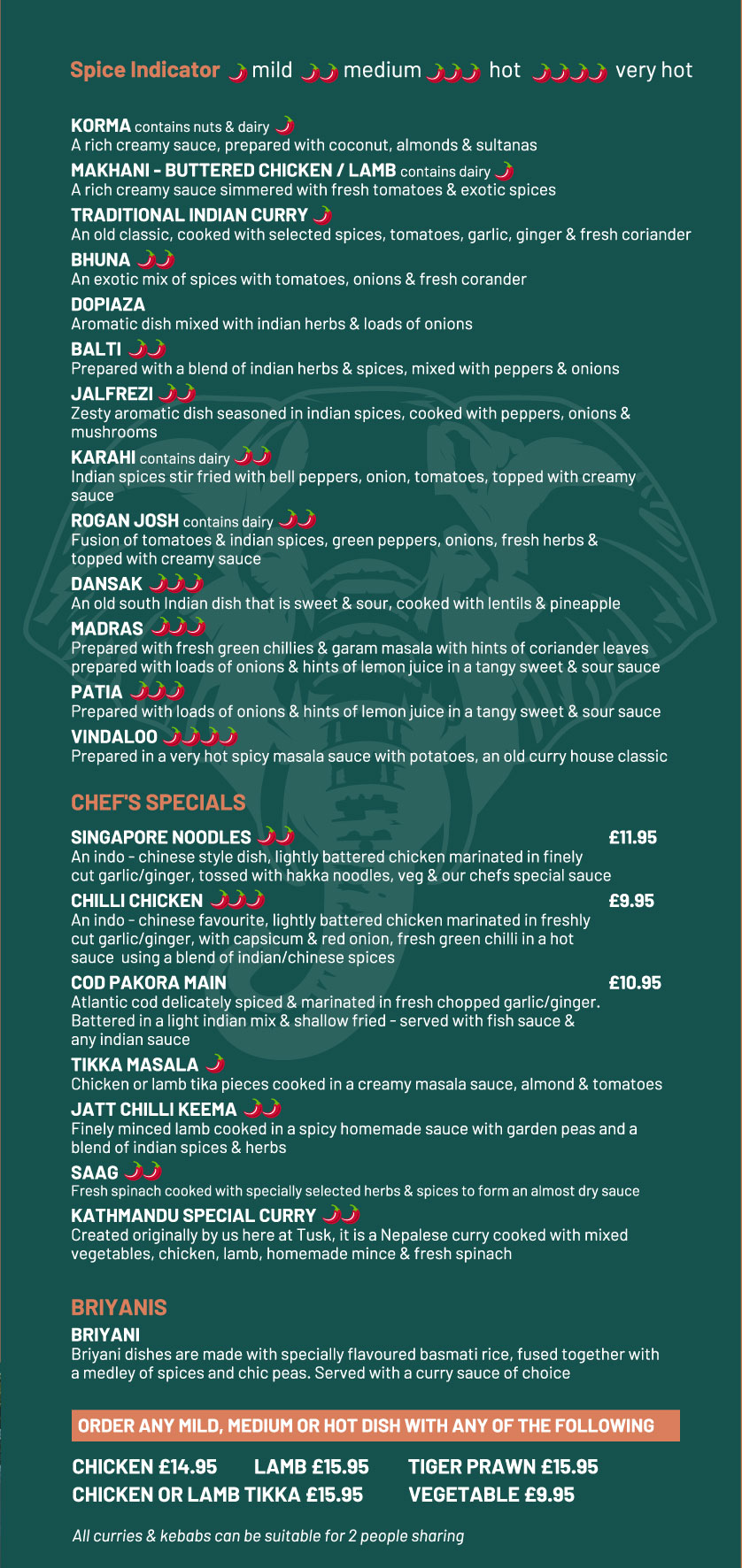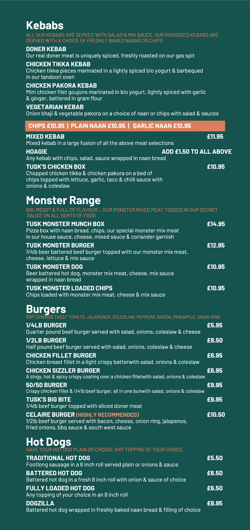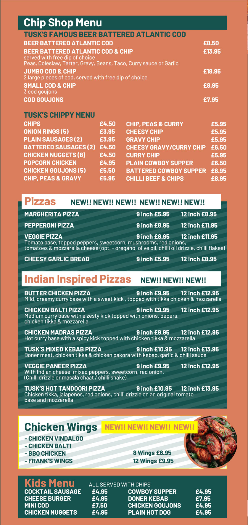 Menu Our MenuBrowse Our MenuHave a look through our menu below, click tor tap to enlarge each section. Ready to order?The easiest way to order is to download our app. Order Online Fancy a tasty gift?Can’t decide when? No problem, click the button below to buy a gift voucher today. Buy a Gift Voucher Want to dine in?Book a table at our award winning restaurant, Tusk. Visit our restaurant